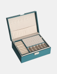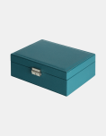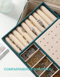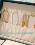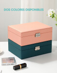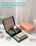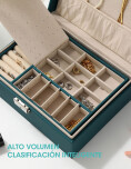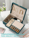 Elegancia y organización en un solo accesorio. Este joyero de dos niveles está fabricado en cuero sintético de alta calidad y cuenta con cierre metálico para mayor seguridad. Su interior aterciopelado protege tus joyas del polvo y los arañazos, mientras que sus múltiples compartimientos permiten guardar anillos, collares, aros, pulseras y relojes de forma ordenada. Diseño de doble nivel con bandeja extraíble Compartimientos y ganchos para collares y pendientes Cierre metálico seguro Ideal para uso diario o para regalar