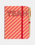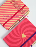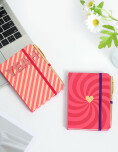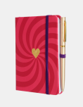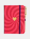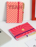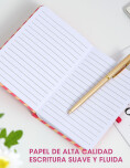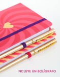 Cuaderno de 95 hojas con tapa dura y diesño tierno, incluye bolígrafo de aspecto elegante y banda elástica. Ideal para estudio o regalo.