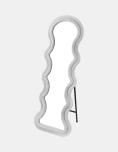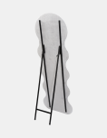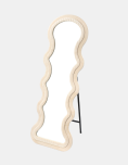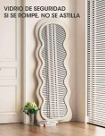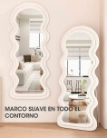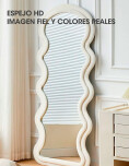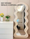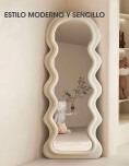 Espejo de cuerpo entero con marco de felpa suave y diseño de borde ondulado, ideal para decorar dormitorios o vestidores. Incluye soporte firme para colocarlo de pie en el piso con estabilidad.