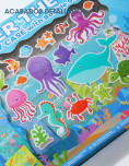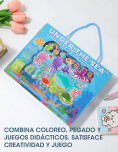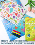 Set creativo infantil para colorear con stickers, inspirado en el mundo marino. Combina dibujo y pegado, ideal para estimular la creatividad y la motricidad fina de los niños mientras juegan.