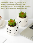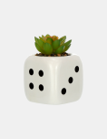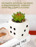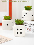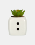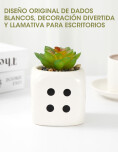Maceta de cerámica con diseño de dado blanco y suculenta artificial incluida. Ideal para sumar un detalle moderno y divertido a cualquier espacio.