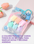 Set de 6 marcadores en tonos pastel. Cada marcador tiene trazo uniforme y secado rápido. Ideal para apuntes, planificación o uso escolar.
