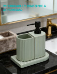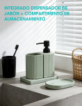 CANTIDAD POR BULTO 6 Set de baño elegante y funcional, ideal para aportar orden y estilo a tu baño. Su diseño minimalista combina fácilmente con cualquier decoración. CARACTERÍSTICAS: - Set completo, incluye: Jabonera + dispenser + Portacepillo. - Fabricado con material resistente y de excelente acabado, pensado para el uso diario. MATERIAL: Cerámica. COLORES: Blanco y verde. (MODELO O COLOR SUJETO A STOCK).