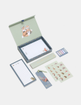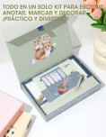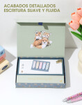Set de papelería con diseño inspirado en animales adorables, presentado en una caja tipo regalo compacta y elegante. Incluye diferentes accesorios para escribir, organizar y decorar.
