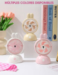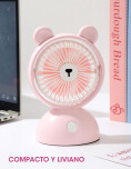 Ventilador de mesa con diseño de animalito, tierno y decorativo. Cuenta con un botón con 2 velocidades, cabezal regulable hasta 90° y base antideslizante para mayor estabilidad. Liviano, silencioso y práctico, ideal para escritorio, dormitorio u oficina. Se carga con USB.